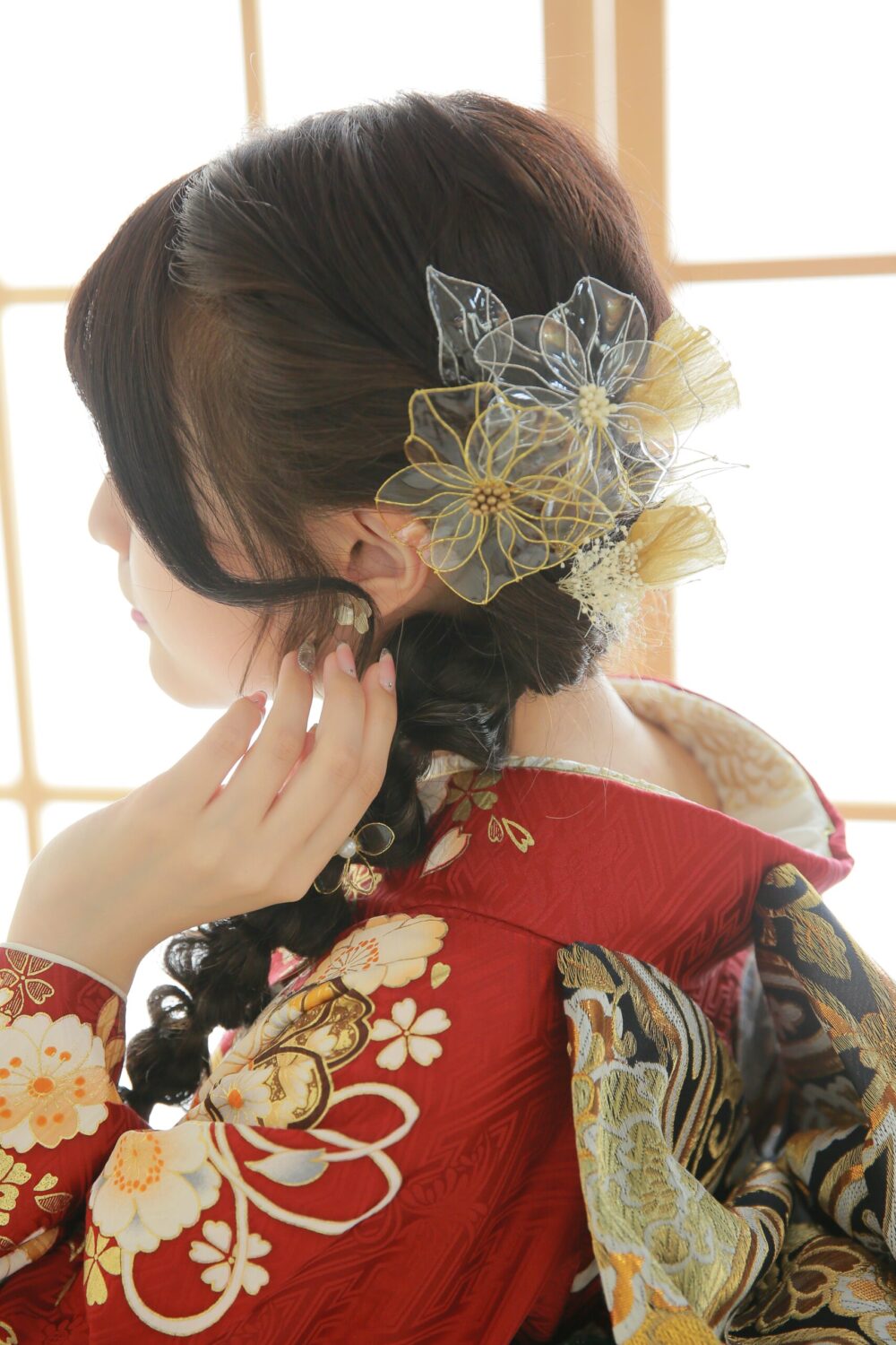 大きな髪飾りで華やかさアップ。金箔をプラスすることでより豪華に仕上がります。