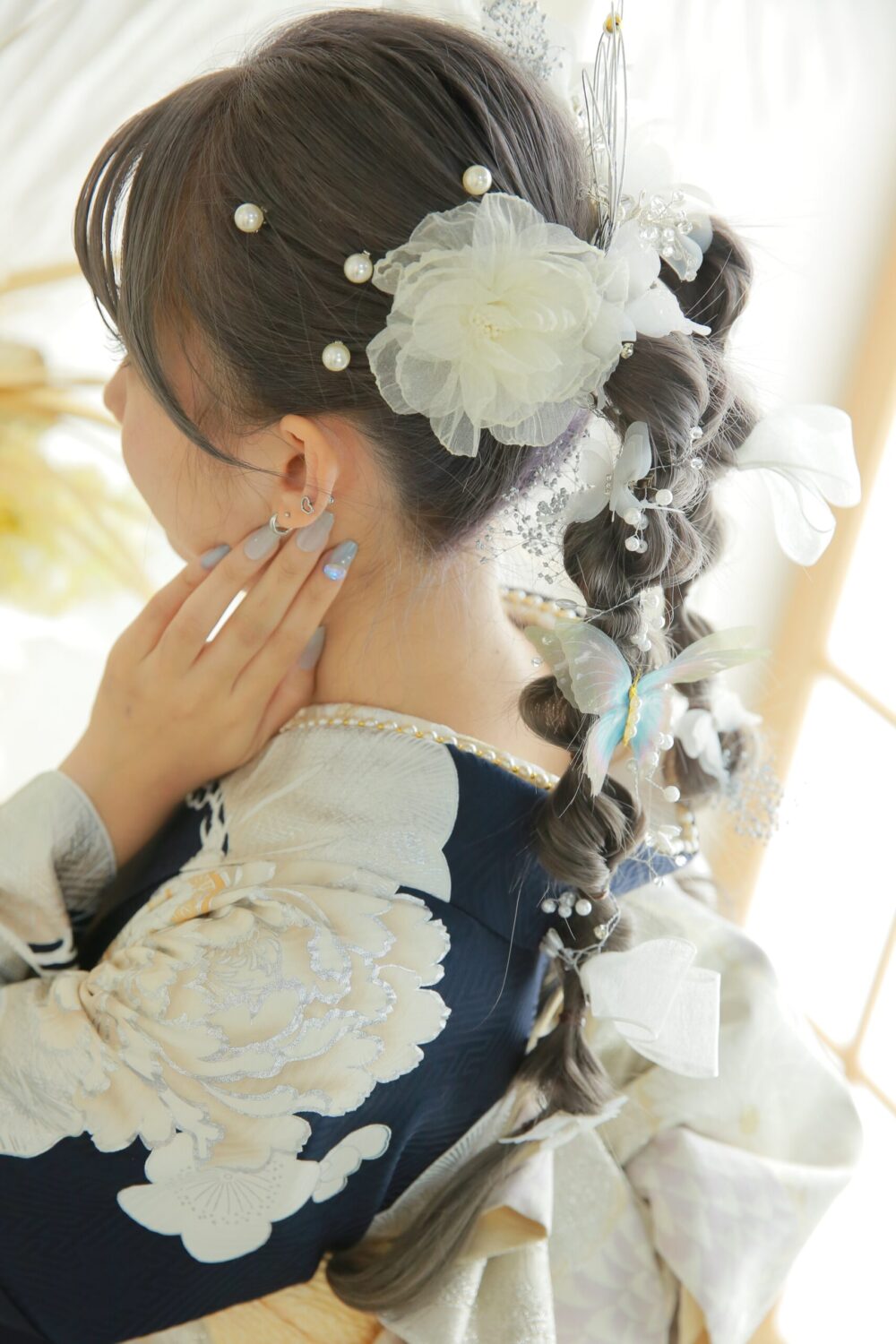 前撮り時は、編みおろした髪の毛を前から見えるように、どちらか片方から見せてあげるのがオススメです。 髪飾りも前から見えるようになりより華やかになります。