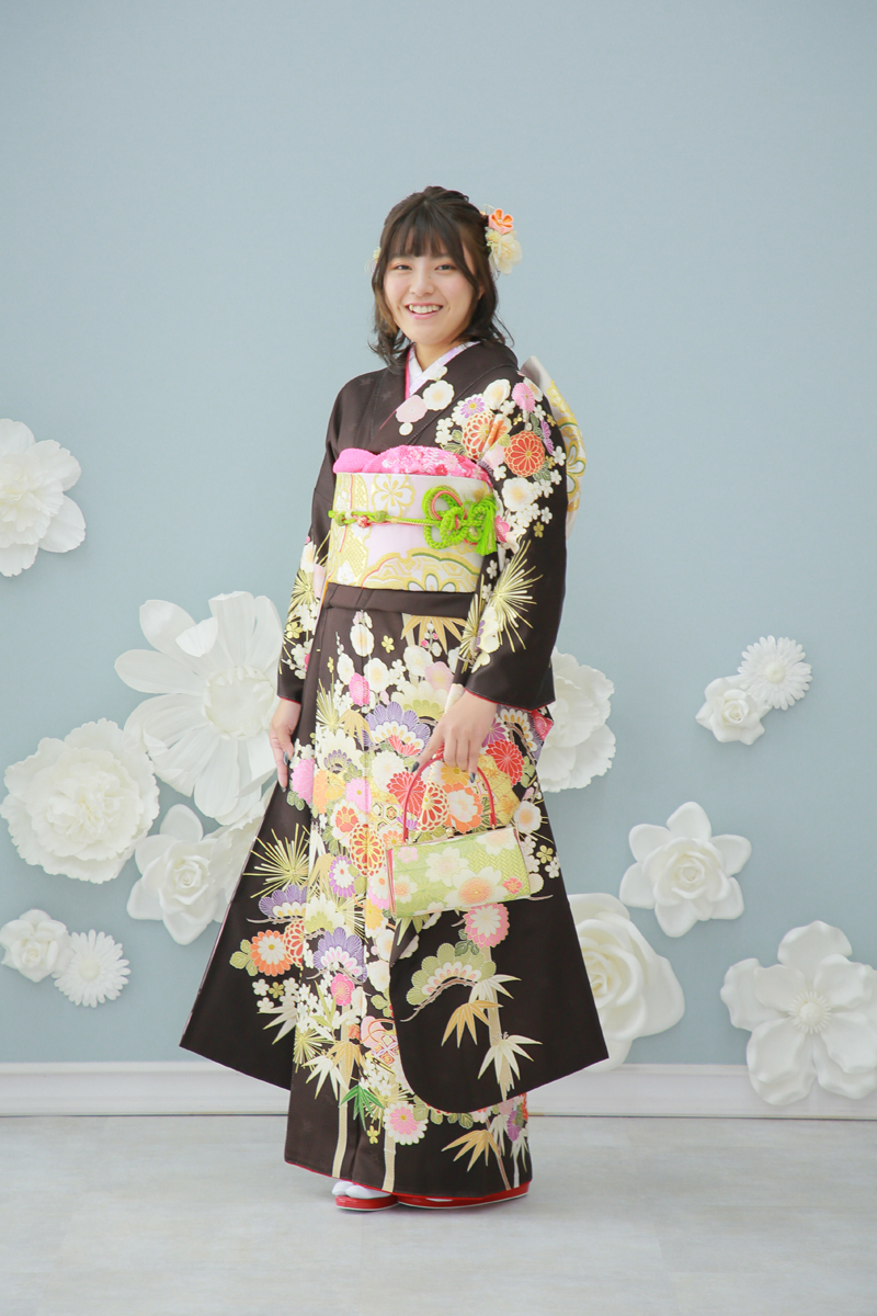 濃いブラウン!落ち着いた色合いで振袖では珍しい色合い!振袖の柄の色に合わせた、小物の色の配色がかわいい!
