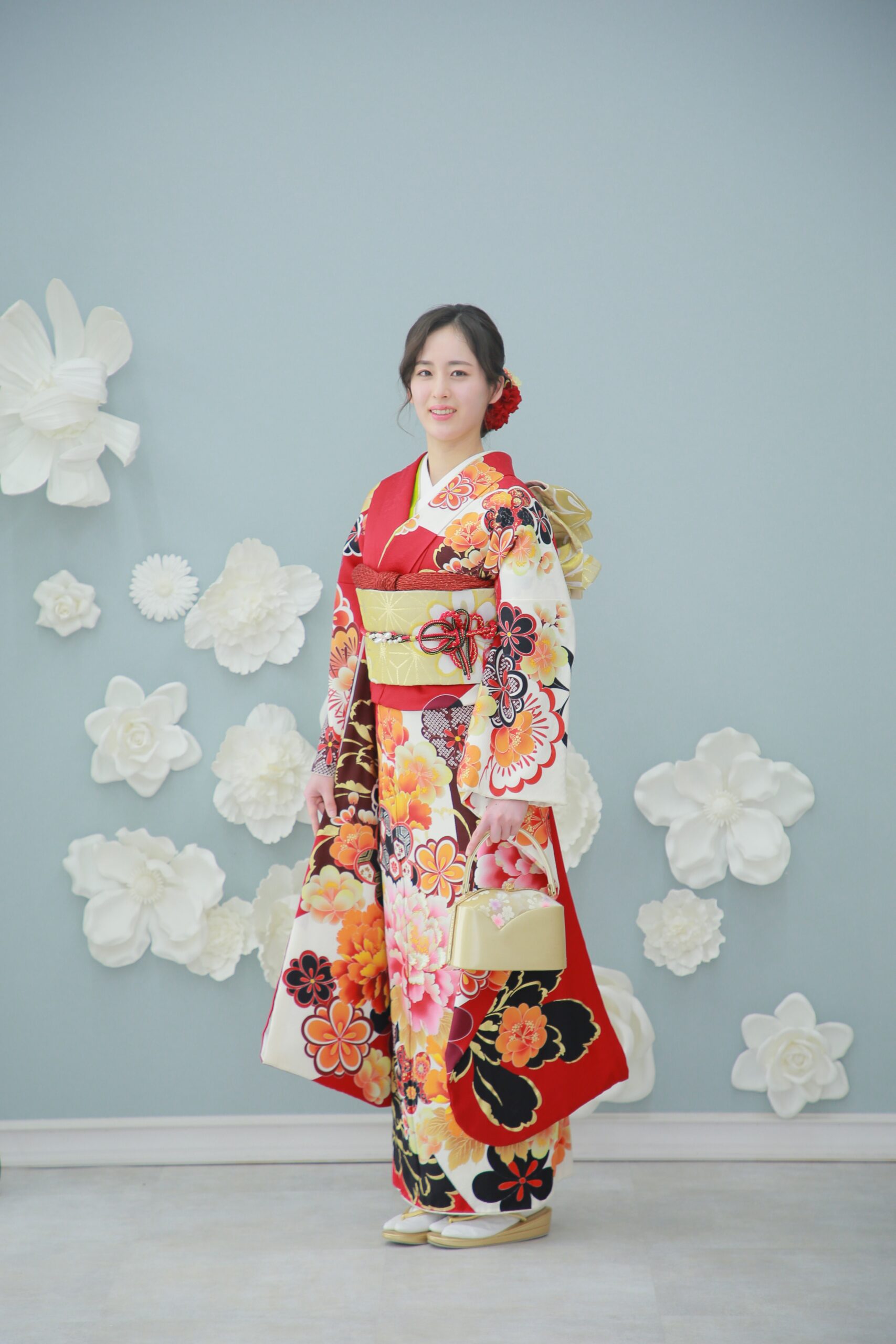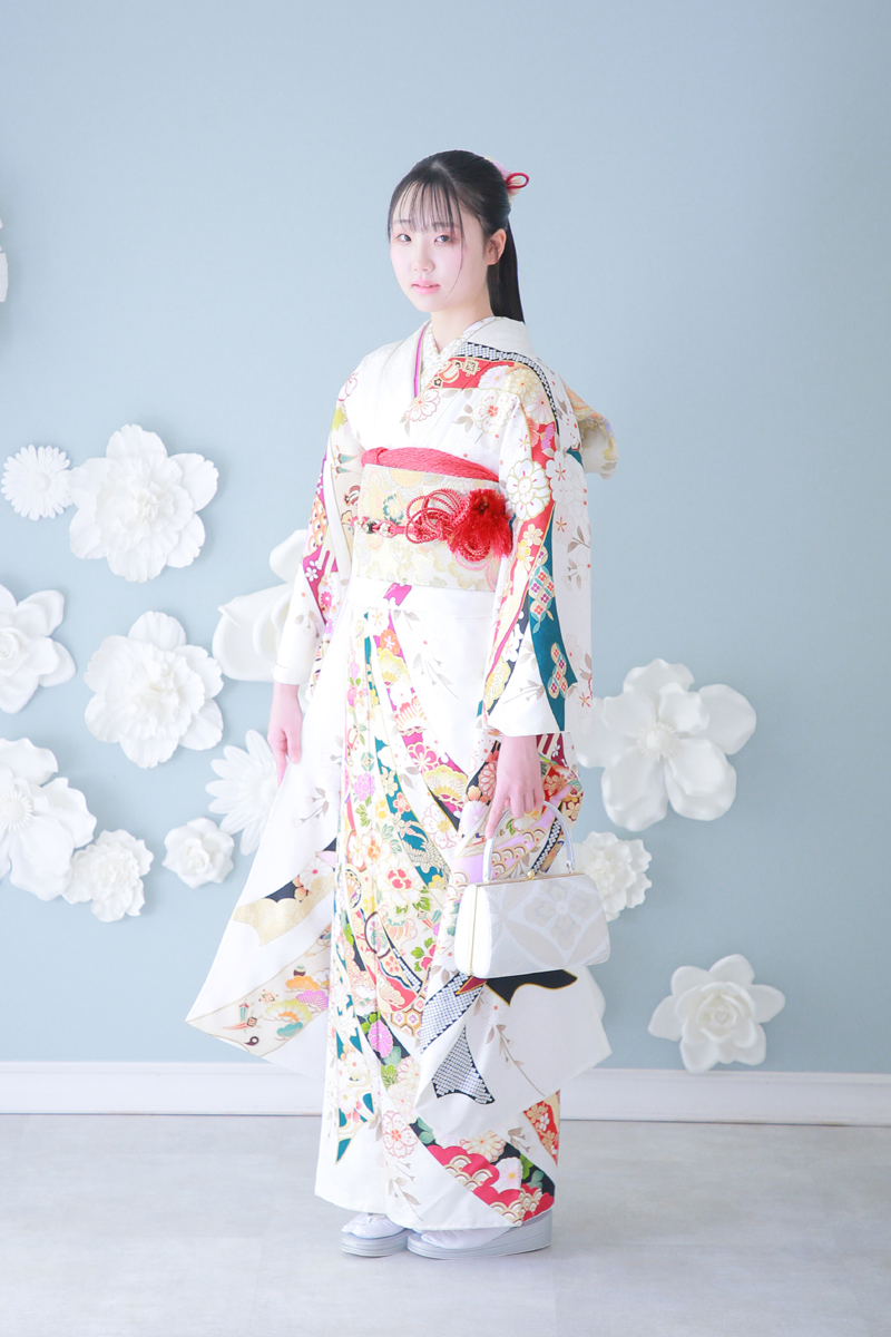 【白赤振袖】白色の振袖に赤色がアクセントになっている振袖!小物にも赤を持ってくることで可愛さ倍増