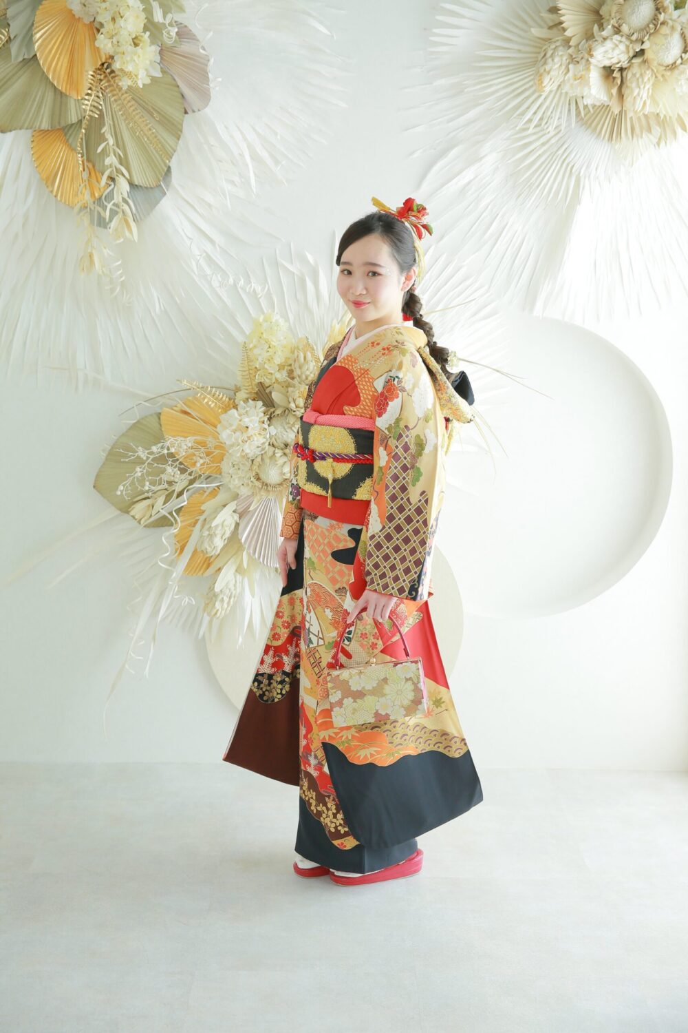 深緑の振袖に赤が加わることで、大人っぽさだけでなく若々しさも表現できます。