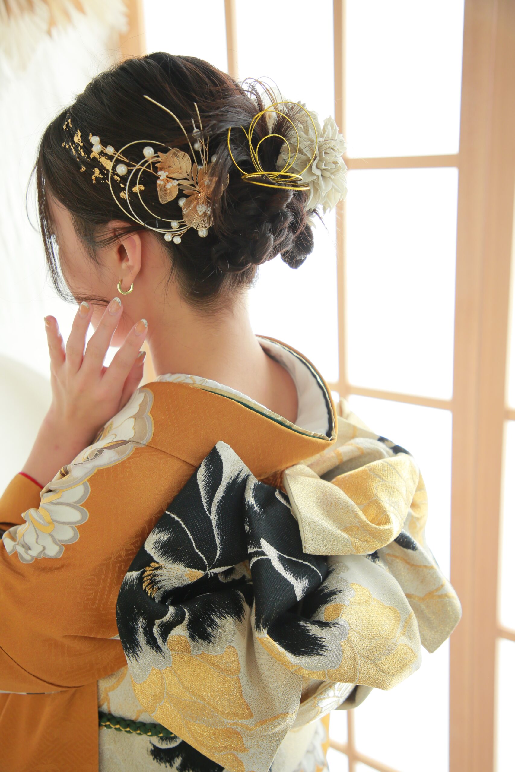 ゴールドの髪飾りは華やかさが印象付けられます。