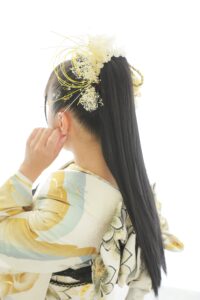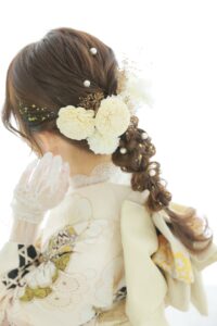どんな髪飾りにあわせやすいヘアスタイルで、着物にはアップスタイルが首が長く見えてスタイルがよく見えるのでおすすめ!