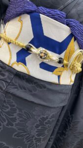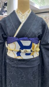 落ち着いた黒のお振袖にビビットな青と華やかな金が目を引きます。