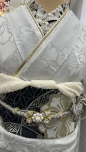 お振袖にあわせて半衿、重ね衿には黒のあしらわれたものを使用しました。