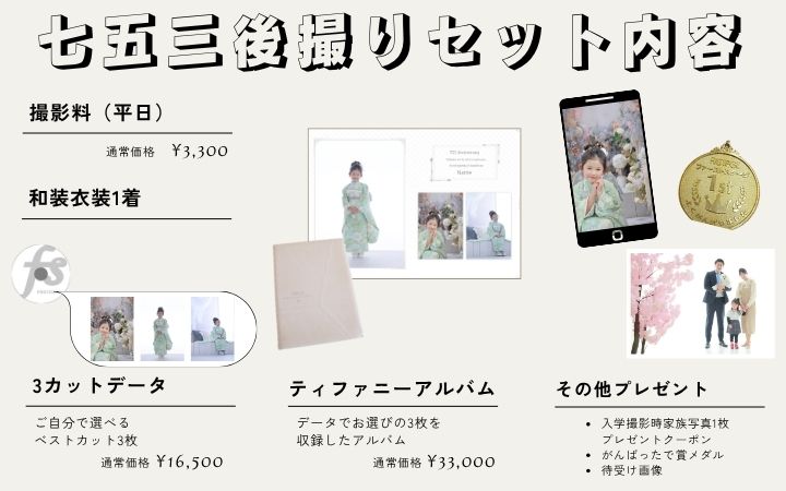 ご予約の際は「七五三後撮り記念セットの予約」とお伝えいただくとスムーズです。