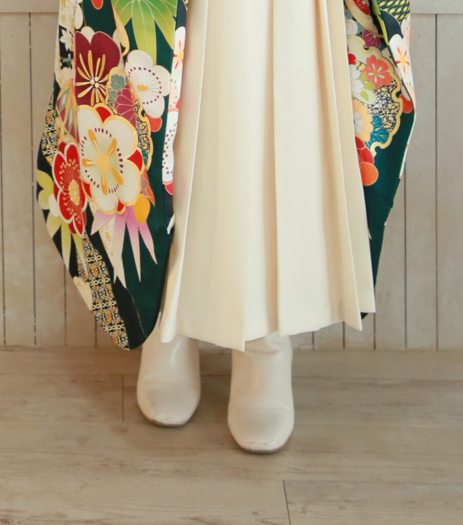 • ブーツ:低身長の方は、ヒールのあるブーツを選ぶと脚長効果が抜群です。袴とブーツの色を合わせると、統一感が出ます。
