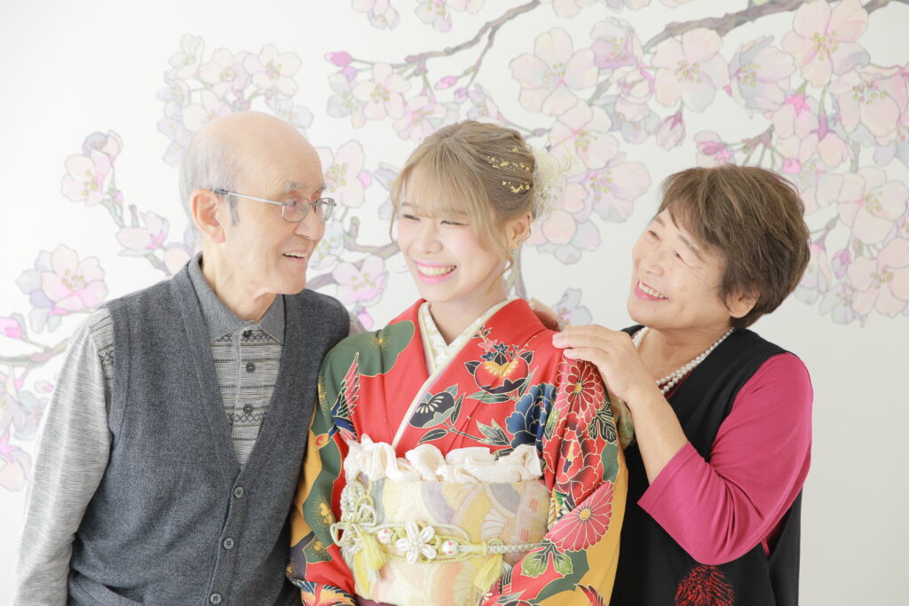 華やかな振袖姿のあなたを囲む笑顔あふれる家族写真は、家庭の宝物となるはずです。