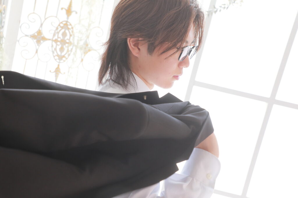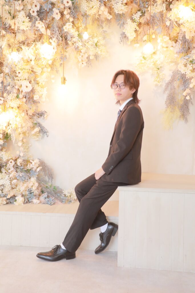ファーストステージの前撮りプランでは、羽織袴に加え、ご持参いただいたスーツでの写真撮影も可能です。