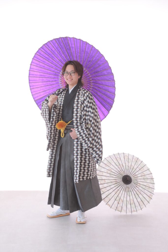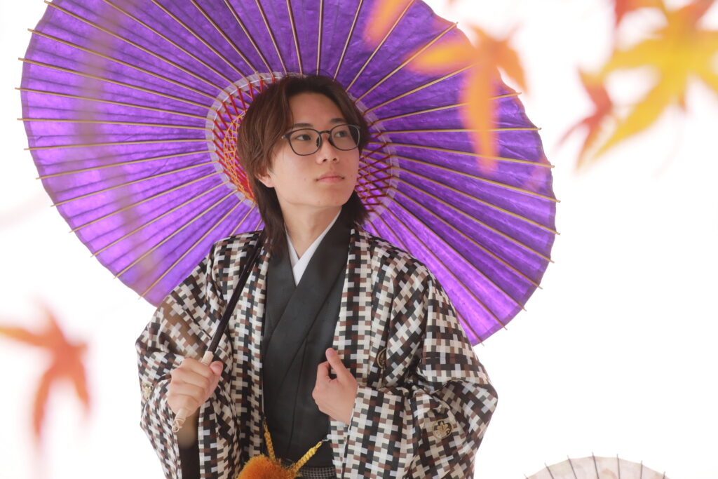 和傘の色と羽織袴が合わせることで、より一層成人式らしい華やかさが出ます。