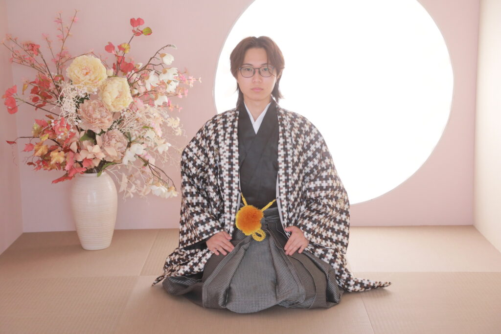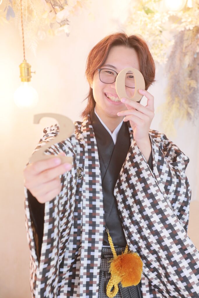 羽織袴での写真は、成人式という日本の伝統的な節目を象徴します。