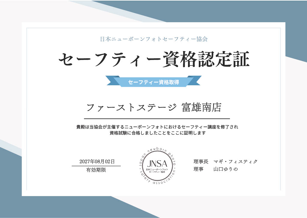 ファーストステージ富雄南店では、ママと赤ちゃんに心から安心して撮影を楽しんでいただくため、日本ニューボーンフォトセーフティ協会(JNSA)の認定資格を取得いたしました。