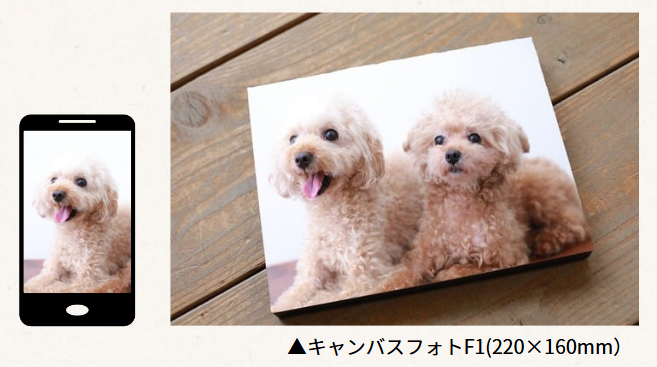 お部屋のインテリアにも馴染む、温かみのある風合いが大人気のキャンバスフォト(F1サイズ / 220×160mm)をお渡しします。