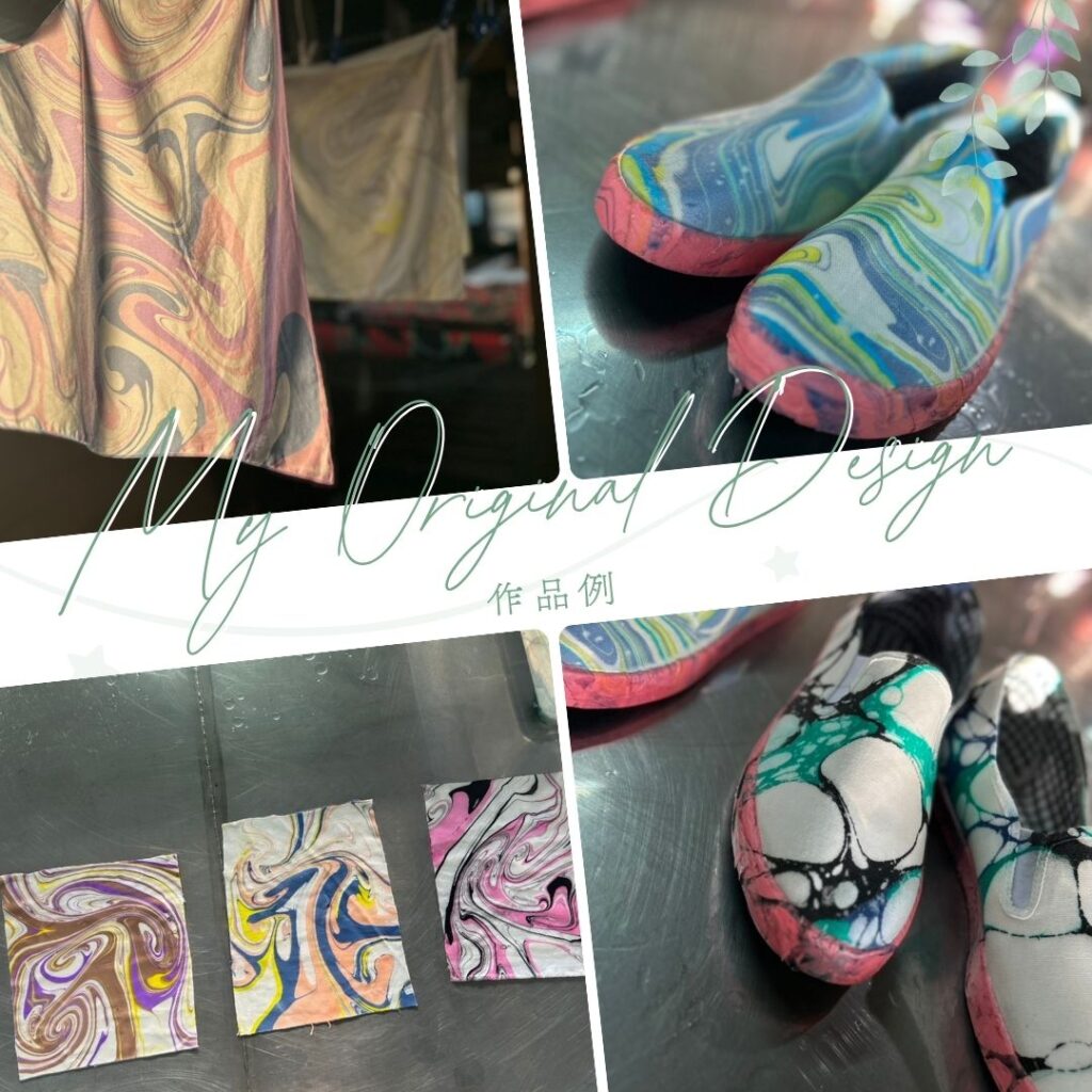 毎日つかう「上履き」や「ハンカチ・巾着」などを、幻想的なマーブル模様でおそろいのデザインに染め上げる体験です。